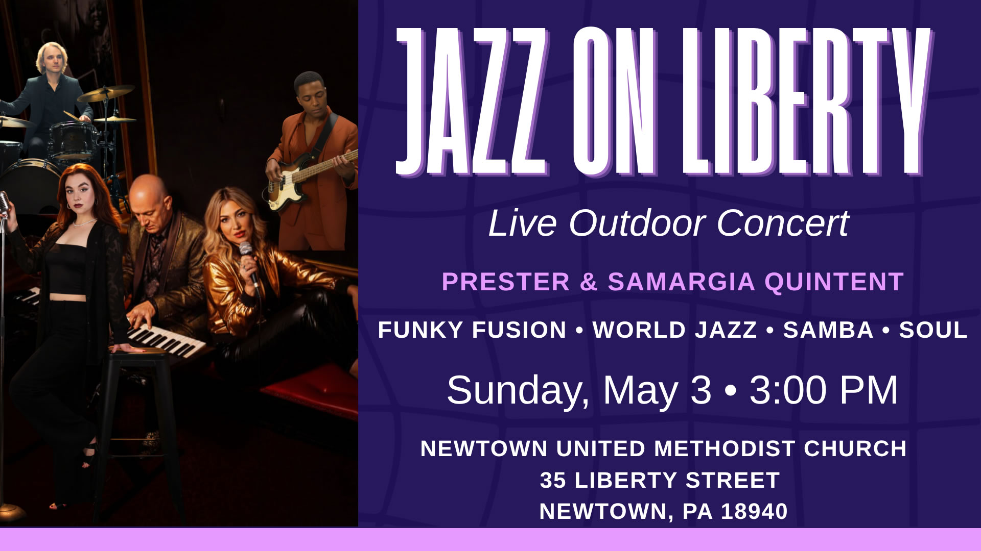 Join us for a vibrant outdoor concert experience featuring the Prester & Samargia Quintet, an ensemble known for blending rich jazz improvisation with global rhythms, Brazilian samba and bossa nova, soulful grooves, and dynamic musical interplay.
